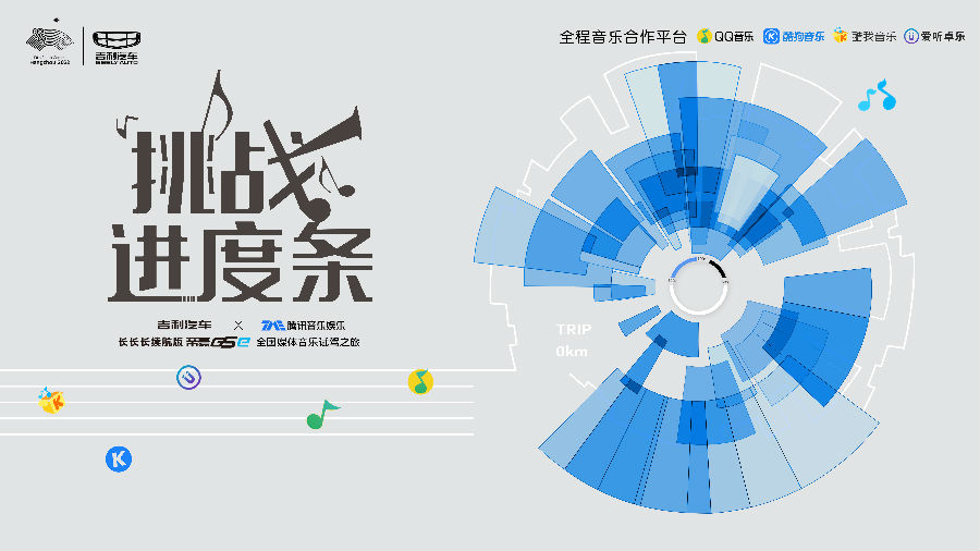 “挑战进度条”主题,不仅包含长长长续航版帝豪GSe的里程自信,更包含了腾讯音乐娱乐对打造跨越车上、车下全场景不间断音乐体验的价值主张。作为这次音乐试驾的全程音乐支持平台,腾讯音乐娱乐将音乐服务渗透到试驾过程中的各个环节。在车上,试驾者可以通过伴听服务享受适合自驾的音乐,在车下,用户可以在酒店大厅、房间、互动区等处发现腾讯音乐提供的音乐二维码,登陆QQ音乐、酷狗音乐、酷我音乐平台即可随时扫码开启音乐之旅。