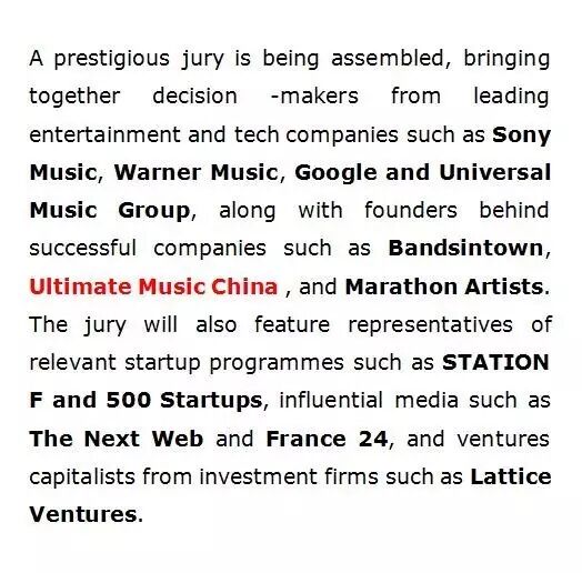大赛的评审团以阵容豪华著称,由全球音乐行业大咖和明星企业领军人物组成,不仅汇聚了谷歌、索尼、华纳和环球等全球领先的音乐娱乐公司的决策者们,还邀请了那些成功的初创公司的创始人。 爱听卓乐作为音乐产业的新锐力量和成功创业的范例,其创始人潘才俊今年被大赛组委会点名邀请成为评委。组委会相信,潘才俊拥有丰富的行业经验和创业体会,将能够为音乐产业初创者提供极富价值的意见和建议,并通过其慧眼挖掘出行业的明日之星。